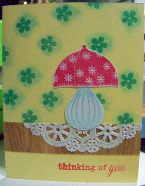 This month's blog hop challenge involves you challenging yourself to use a Papertrey stamp set that has yet to see ink or even one that might be collecting a little dust! Go through your stash and see what little used treasure it might hold.My stash of PTI stamps is limited and I haven't been stamping lately so I could use anything. I like using images in a different way than their original designer had in mind. This lamp was an umbrella and a hot air balloon. The wall paper is the small flower in the Up, Up and Away. A bit of doily and a small piece of K & Company wood grain patterned paper make this look a bit like a scene from grandma's house.
